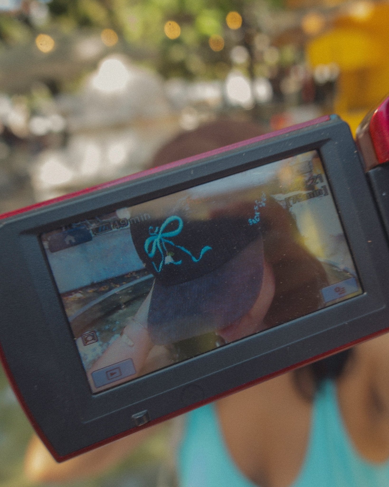 This design is made from tobacco-hued cotton corduroy and features the blue Backstories bow on the front and lettering on the side.
