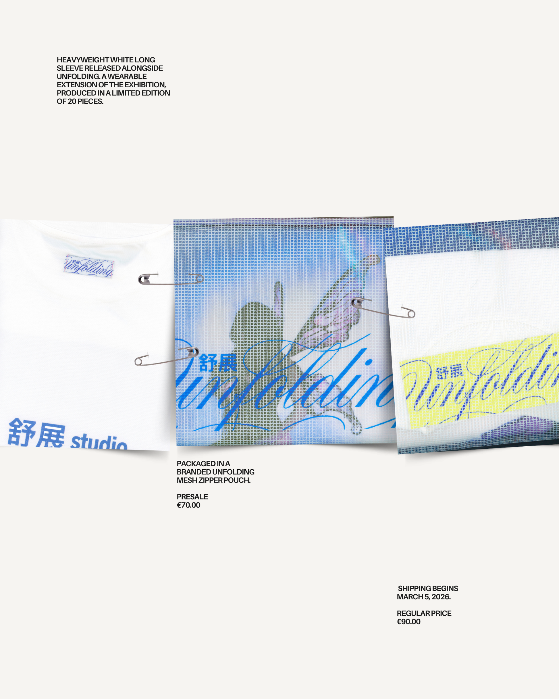 Heavyweight white long sleeve released alongside Unfolding. A wearable extension of the exhibition, produced in a limited edition of 20 pieces.